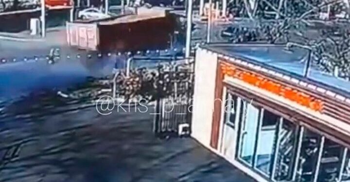 Очевидцы отметили, что все это время с грузовика вылетали металлические части — рессоры Shacman пробили крышу навеса, а также лобовое стекло Land Cruiser.