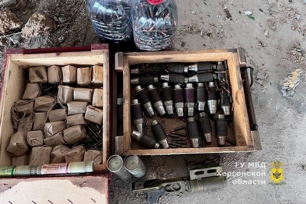 Из схрона были изъяты 23 выстрела для подствольного гранатомета, а также 2 дымовых гранаты, 2 реактивных сигнальных патрона, и сотни патронов калибра 5,45 мм и 7,62 мм.