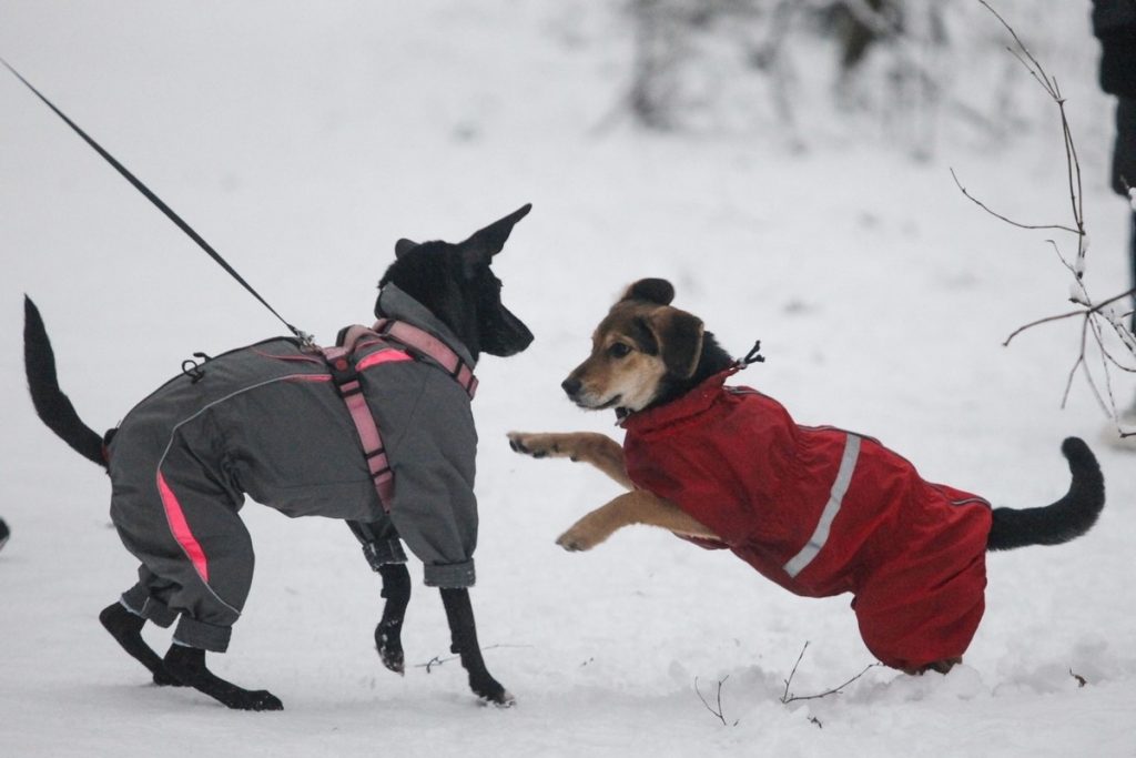 Активных собак в морозы достаточно одеть в непродуваемую собачью одежду. Собачья обувь в этом случае не нужна – у лап своя терморегуляция, и при быстром перемещении мерзнуть они не будут.