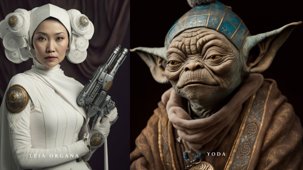 Искусственный интеллект Midjourney представил ряд героев: Люка Скайуокера, Дарта Вейдера, Йоду, Хана Соло и других, сгенерировав их черты лица к азиатскому типажу. Таким образом, джедай Люк не лишился светлых волос, однако его глаза стали карими, а лицо более округлым.