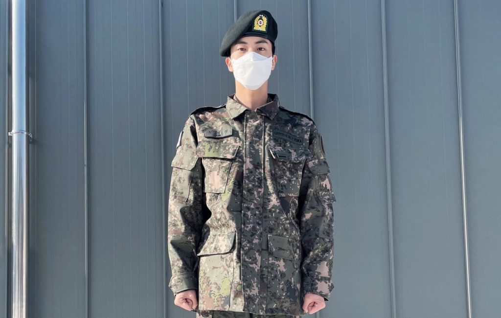 идол отправился в Weverse, чтобы поделиться своим первым обновлением в социальных сетях с момента призыва в армию в декабре 2022 года, где он разместил свои фотографии в военной форме после на церемонии завершения обучения.