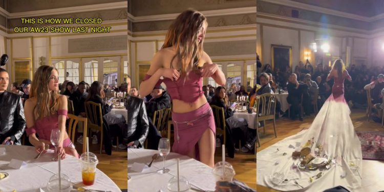 Видео с показа бренда (Di)vision на Неделе моды в Копенгагене разлетается в сетях из-за неожиданной концовки. Оказалось, что скатерть стола, за которым сидела модель, была продолжением костюма. Шокированные зрители с удовольствием наблюдали, как она уносит за собой подносы, ножи и бокалы. Подробнее рассказывает Fil.kz.