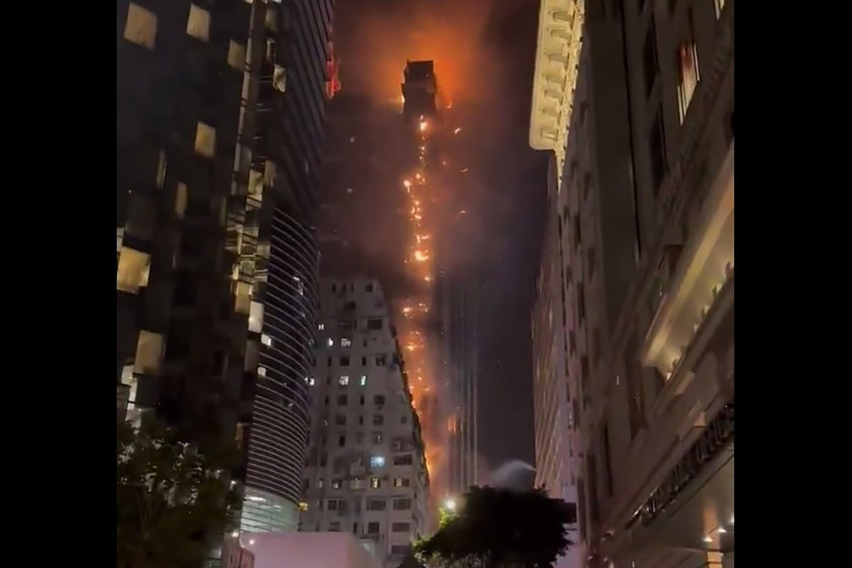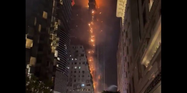 В Гонконге произошел пожар в строящемся небоскребе. Согласно публикуемым кадрам очевидцев, пламя распространилось по всей высоте 42-этажного здания.