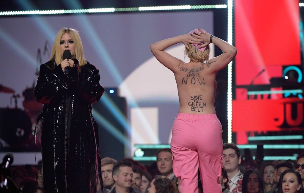 Во время церемонии в понедельник (13 марта) Лавин представляла представление, когда позади нее появился протестующий топлесс.