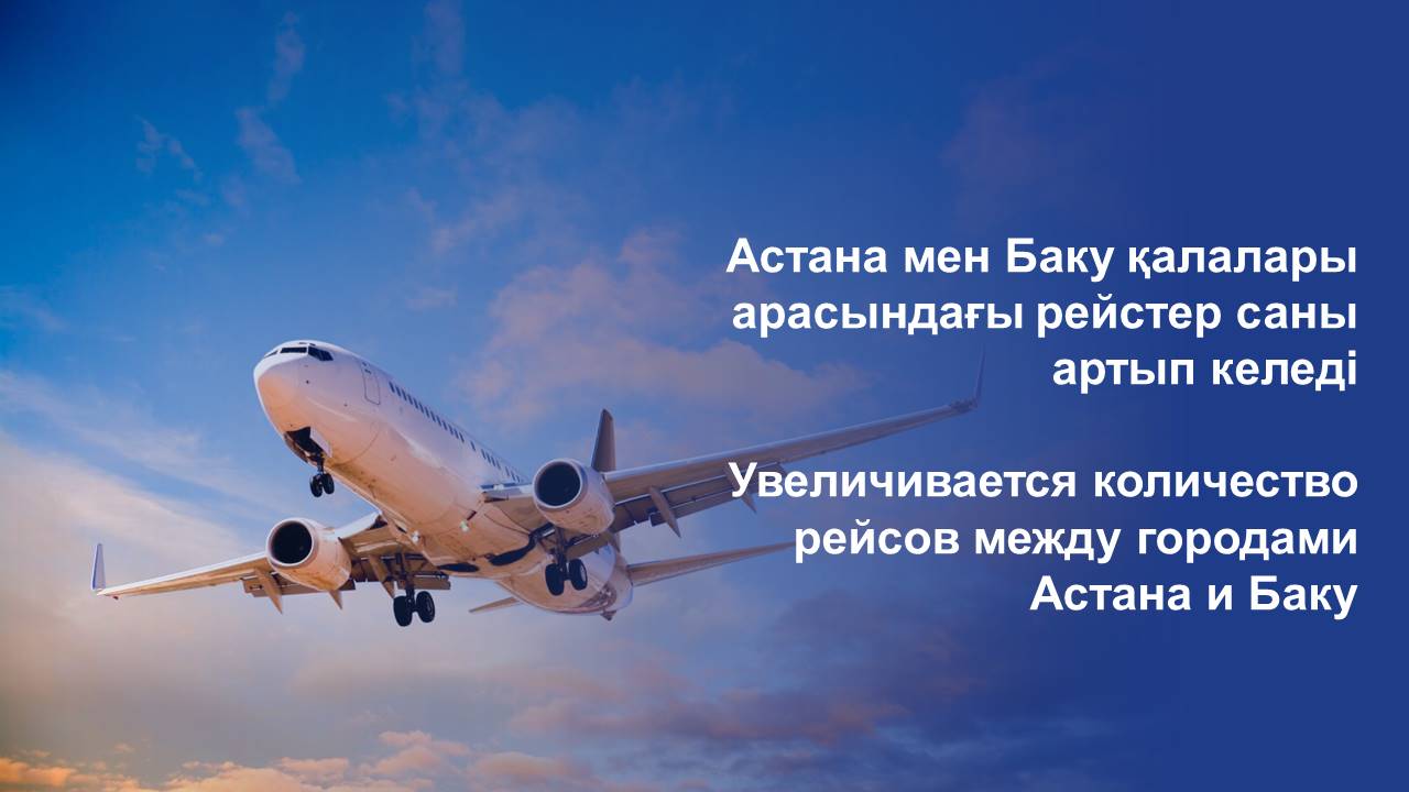 Вместе с тем, в настоящее время регулярные рейсы по направлению в Республику Азербайджан выполняются по маршрутам Алматы – Баку авиакомпанией «Эйр Астана» с частотой 2 раза в неделю, Актау – Баку авиакомпаниями «Fly Arystan» и «Azerbaijan Airlines» по 3 раза в неделю, а также Актобе – Баку авиакомпанией «Qazaq Air» 2 раза в неделю.