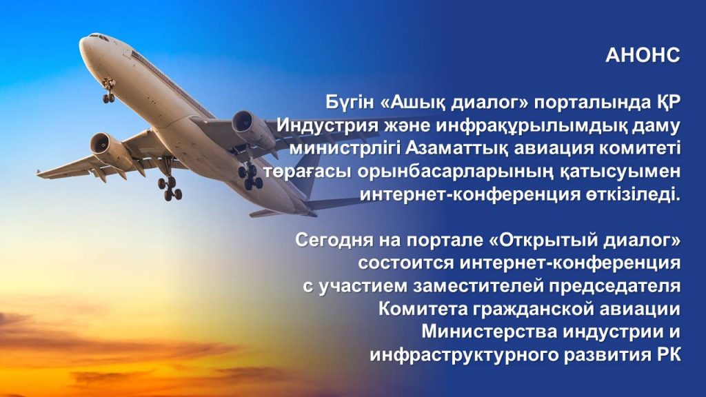 Сегодня на портале «Открытый диалог» состоится интернет-конференция с участием заместителей председателя Комитета гражданской авиации Министерства индустрии и инфраструктурного развития РК.