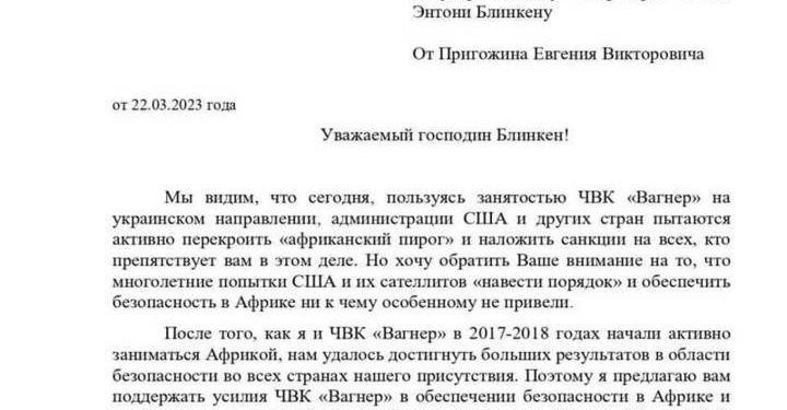 Письмо, опубликованное в телеграм-канале Кепка Пригожина, стало ответом на заявление Блинкена, в котором он обвинил ЧВК «Вагнер» в провоцировании насилия и нестабильности в Африке.