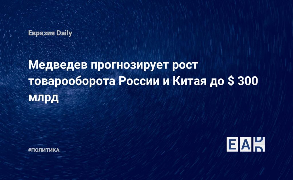 Объем взаимной торговли России и Китая в ближайшие пару лет может превысить $ 300 млрд. Такое мнение высказал заместитель главы Совета безопасности РФ Дмитрий Медведев, отвечая на вопрос ТАСС в интервью российским СМИ и пользователям «ВКонтакте».