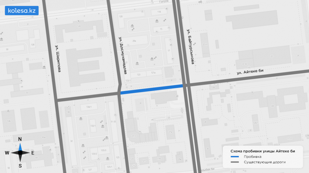В данное время перекрёсток Айтеке би — Байтурсынова Т-образный. Плюс к нему примыкает автозаправочная станция. Но, согласно проекту, АЗС планируется не трогать, а дорогу проложить чуть ниже до улицы Досмухамедова.