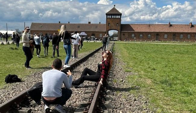 На снимке запечатлено, как молодой человек фотографирует улыбающуюся девушку, которая на фоне главных ворот бывшего лагеря смерти, позируя, присела на рельсы, по которым нацисты отправляли людей на гибель.