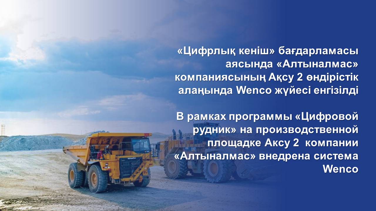 Цифровизация и автоматизация промышленных объектов «Алтыналмас» ведется в рамках программы «Цифровой рудник», которая реализуется с 2017 года и направлена на повышение операционной эффективности, снижение производственных издержек, улучшение результативности персонала путем использования передовых практик и инновационных подходов с применением новых информационных технологий и инструментов. В планах – установка системы Wenco и на других производственных площадках.