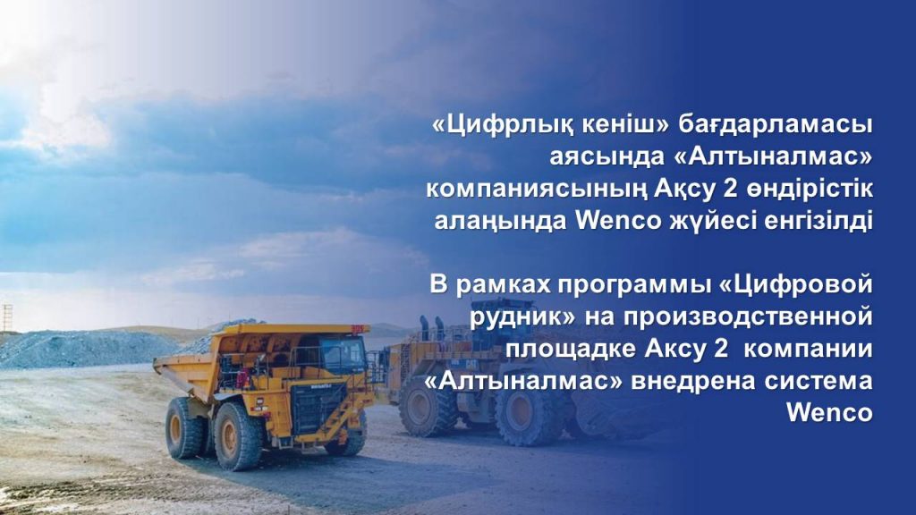 Цифровизация и автоматизация промышленных объектов «Алтыналмас» ведется в рамках программы «Цифровой рудник», которая реализуется с 2017 года и направлена на повышение операционной эффективности, снижение производственных издержек, улучшение результативности персонала путем использования передовых практик и инновационных подходов с применением новых информационных технологий и инструментов. В планах – установка системы Wenco и на других производственных площадках.