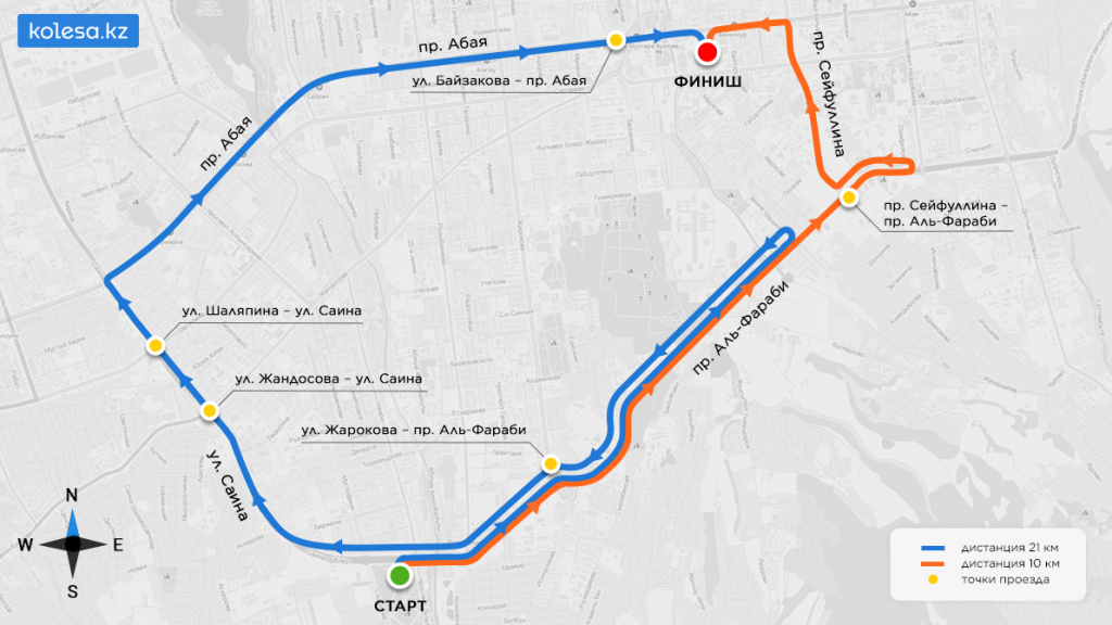 Аль-Фараби до Абая — с 8:30 до 10:10. Движение машин по западной стороне Саина ограничивать не станут.