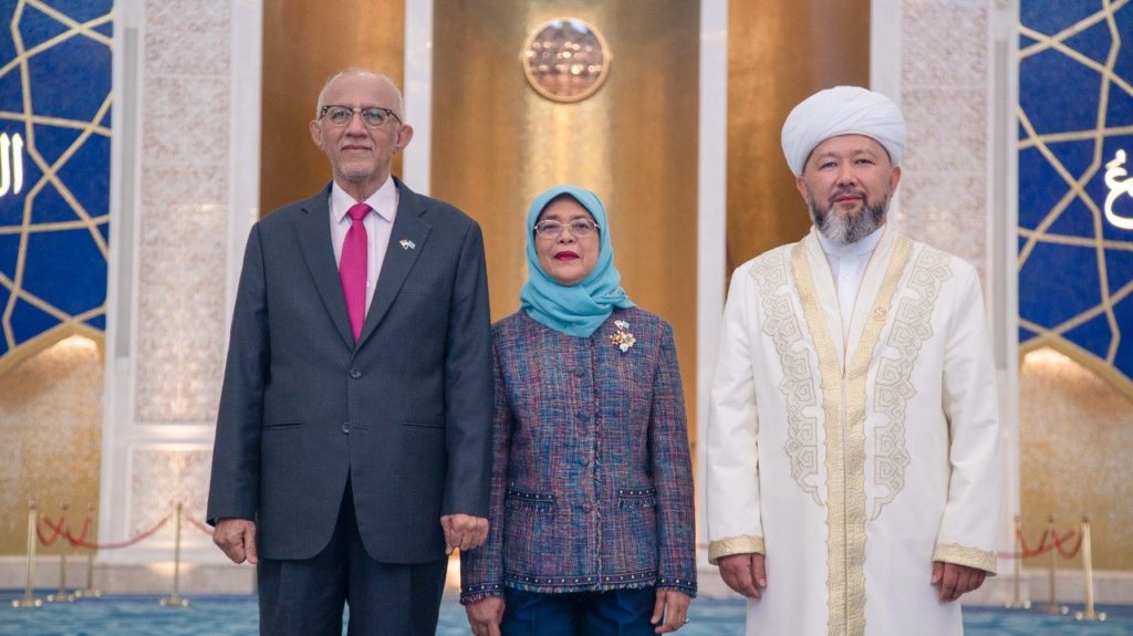 Сегодня Председатель Духовного управления мусульман Казахстана Наурызбай кажы Таганулы встретился с Президентом Сингапура Халимой Якоб, прибывшей с государственным визитом в нашу страну, в Главной мечети Астаны и рассказал ей об уникальности этого культового сооружения среди других. Верховный муфтий также поделился информацией о работе, которую проводит организация в направлении сохранения преемственности религии и традиций, удовлетворения духовных потребностей общества, прославления национальных ценностей и популяризации исламской религии. После этого высокий гость посетил музей, открытый в мечети, и поднялся на туристическую башню мечети, чтобы наблюдать за жизнью города с высоты.