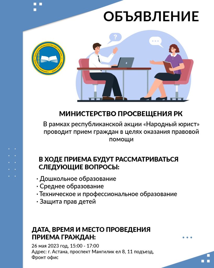 Министерство просвещения РК в рамках республиканской акции «Народный юрист» проводит прием граждан в целях оказания правовой помощи.