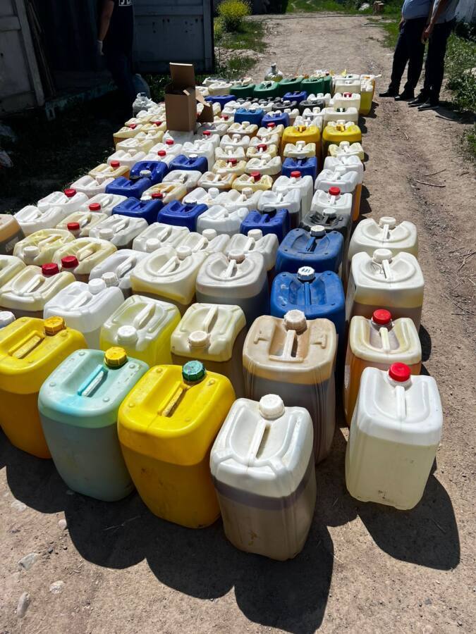 – В ходе проведения оперативных мероприятий было установлено место недавней локации контейнера – крестьянское хозяйство на территории Жамбылского района Алматинской области. Там же обнаружены еще два контейнера, являющиеся местом изготовления синтетического наркотика. Изнутри исходил едкий запах. Установлено, что преступное производство наладили двое приезжих: они арендовали контейнеры под видом содержания скота. Для конспирации своей деятельности даже имели шесть голов крупнорогатого скота. В ходе обыска трех контейнеров были изъяты стеклянные лабораторные колбы, 324 канистры с жидкостями, общим весом около 8 тонн, порядка 70 кг комкообразного вещества бежевого цвета, со специфическим запахом, – сообщил заместитель начальника ДП города Алматы Дидар Аханов.