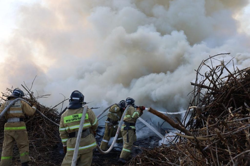 Из-за пожара на территории между шоссе Коргалжын и объездной дорогой в сторону города Косши, в столице видны клубы дыма и запах гари, сообщает Optimism.kz. В связи с этим, управление общественного здравоохранения города призывает жителей не выходить на улицу без необходимости, закрыть окна в квартирах и надевать маски на улице, особенно людям с заболеваниями органов дыхания. Пожарные работают над тушением возгорания на площади 15 га, задействовано 140 человек и 40 единиц техники. Фото: Акимат Астаны.