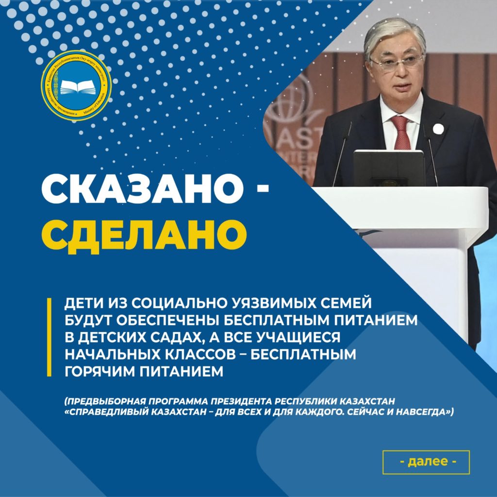 СКАЗАНО: Дети из социально уязвимых семей будут обеспечены бесплатным питанием в детских садах, а все учащиеся начальных классов – бесплатным горячим питанием.