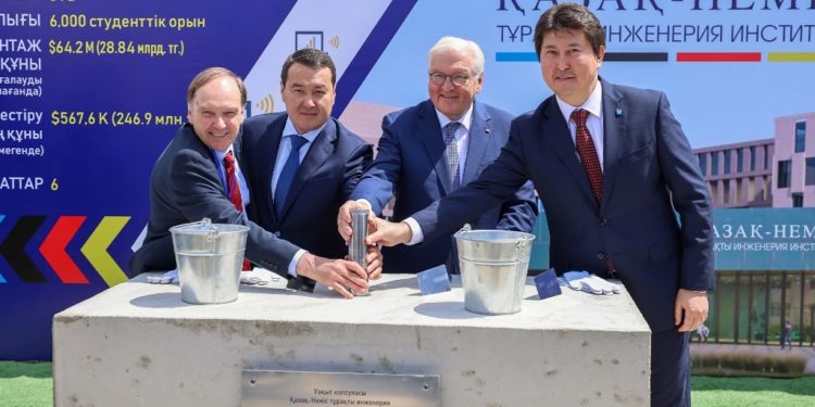 Федеральный Президент Германии Франк-Вальтер Штайнмайер и Премьер-Министр Казахстана Алихан Смаилов приняли участие в церемонии закладки капсулы времени в рамках строительства здания Казахско-Немецкого института устойчивой инженерии в Актау. Новое учебное заведение создано в рамках развития взаимовыгодного стратегического партнерства между Казахстаном и Германией в сфере высшего образования и науки. Казахско-Немецкий институт будет вести подготовку востребованных технических специалистов из числа местной молодежи и жителей других областей страны на основе передового опыта в области инженерии. Обучение первых студентов бакалавриата начнется уже в сентябре текущего года, а в 2029 году они вскроют капсулу времени, в которую было заложено письмо с обращением к первому выпуску нового вуза.