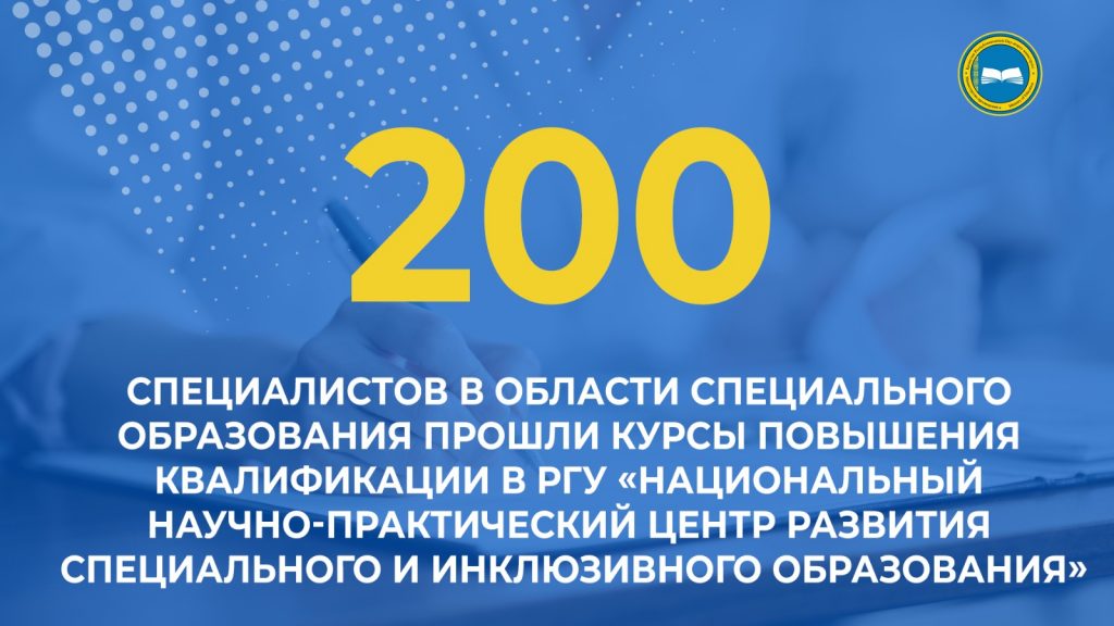 В РГУ «Национальный научно-практический центр развития специального и инклюзивного образования» прошли 8 курсов повышения квалификации для 200 специалистов. Курс смешанного формата состоял из 36 часов онлайн-лекций и 36 часов в режиме офлайн.