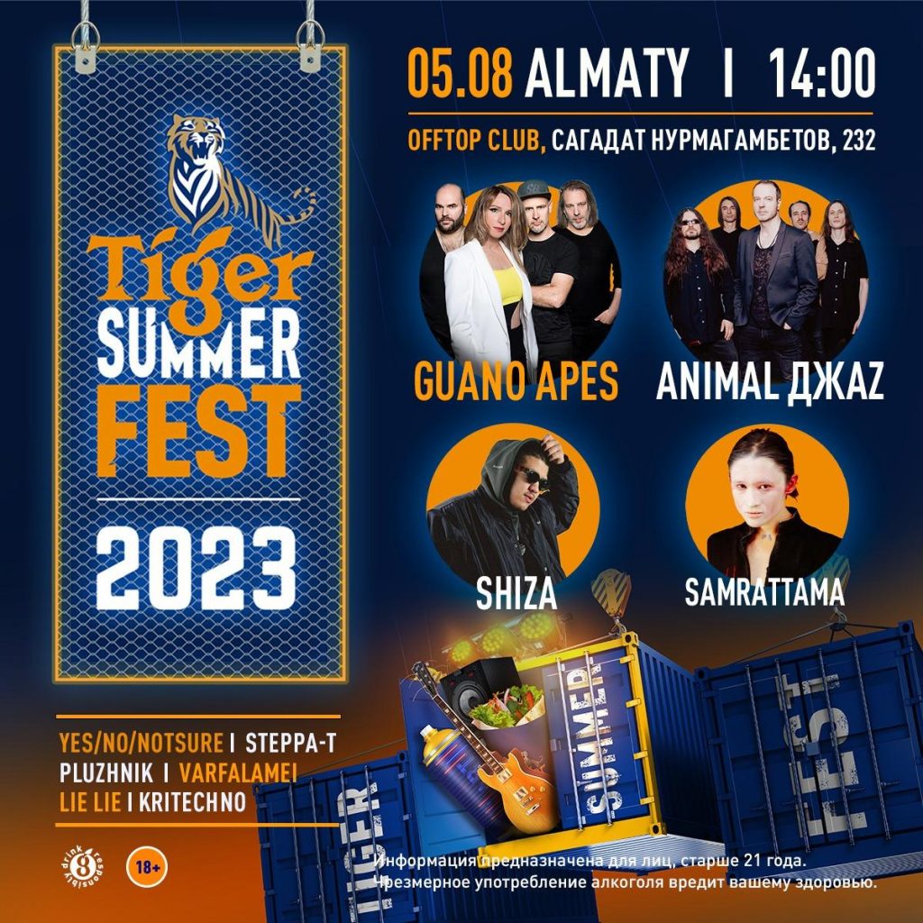 5 августа 2023 года на территории Offtop club (Сагадат Нурмагамбетов, 232) пройдет второй ежегодный Tiger Summer Fest — уникальный летний праздник, объединивший стильную музыку, стрит-арт и стрит-фуд.