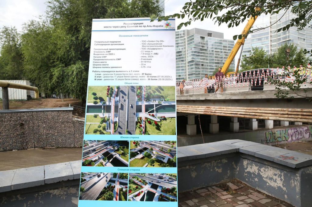 «Крайние плиты пролетных строений имеют критические дефекты в виде сколов бетона ребра с уменьшением рабочих сечений в опорной зоне, также разрушение защитного слоя бетона с оголением напрягаемой арматуры, что относится к категории опасных, так как значительно снижают грузоподъемность пролетного строения. Поэтому начаты работы по реконструкции моста. Всего запланирован демонтаж и монтаж плит пролетного строения в количестве 96 штук. Также проектом предусмотрено два велопешеходных моста с северной и южной стороны для безопасности пешеходов. Нормативная продолжительность строительства составляет девять месяцев, но работы ведутся с опережением графика производства работ, в две смены. В связи с этим реконструкцию моста планируется завершить до начала учебного года, обустройство велопешеходных мостов – до середины октября т.г. Завершение работ по благоустройству прилегающей территории запланировано на февраль 2024 года», — отметил руководитель отдела развития дорожной инфраструктуры Управления городской мобильности Алматы Айдос Желдикбаев.