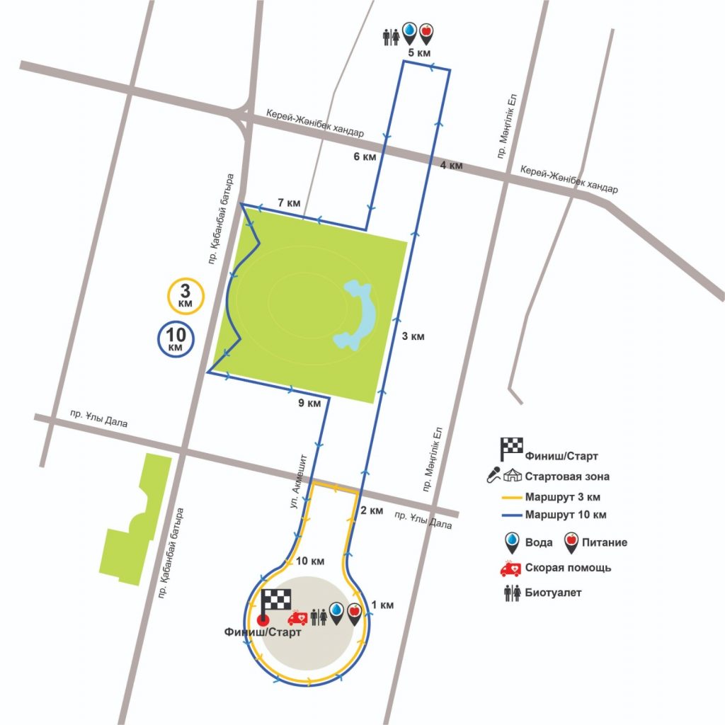 — Также для дистанции 3 километра будет перекрыт участок по улице Улы Дала между улицей Акмешит и улицей Туркестан.