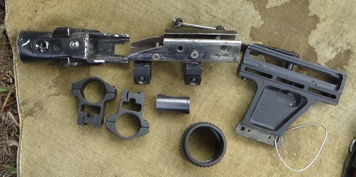 Также, при обыске у охотника изъяли разобранную ручную гранату Ф1, самодельный станок для пристрелки ружья, запчасти на ружья: цевье, тыльник приклада, спусковые скобы, затвор, антабки и части ударно-спускового механизма, 8 прикладов и лож огнестрельного ружья, бакелитовый магазин АК-74, пистолетные рукояти для ружей, три ножа кустарного производства, барабан от револьвера Perfecta калибра 8 мм, крепления для оптических прицелов, чехлы для ружей, ремни, лекало для изготовления приклада (скелетного типа), 20 гильз калибра 12 мм, магазин пистолета, пистолет Perfecta (украден в РФ в 2017 году), гладкоствольное незарегистрированное оружие МЦ-2112.