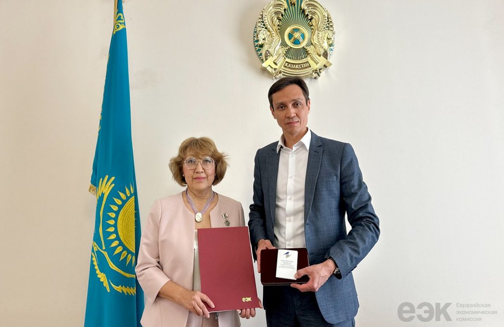 Ардак Тулегенова, руководитель управления РГП «Национальный центр экспертизы лекарственных средств и медицинских изделий» Комитета медицинского и фармацевтического контроля Министерства здравоохранения Республики Казахстан, была награждена нагрудным знаком Евразийской экономической комиссии за вклад в развитие евразийской интеграции. Награда была вручена Тимуром Нурашевым, директором Департамента технического регулирования и аккредитации Евразийской экономической комиссии, на торжественном заседании в Алматы 9 августа. По информации Optimism.kz, нагрудный знак был вручен за значительный вклад в разработку и принятие Фармакопеи Евразийского экономического союза, дополнений в Фармакопею ЕАЭС, создание общего рынка лекарственных средств Союза и в связи с юбилеем. Фото: eec.eaeunion.org.