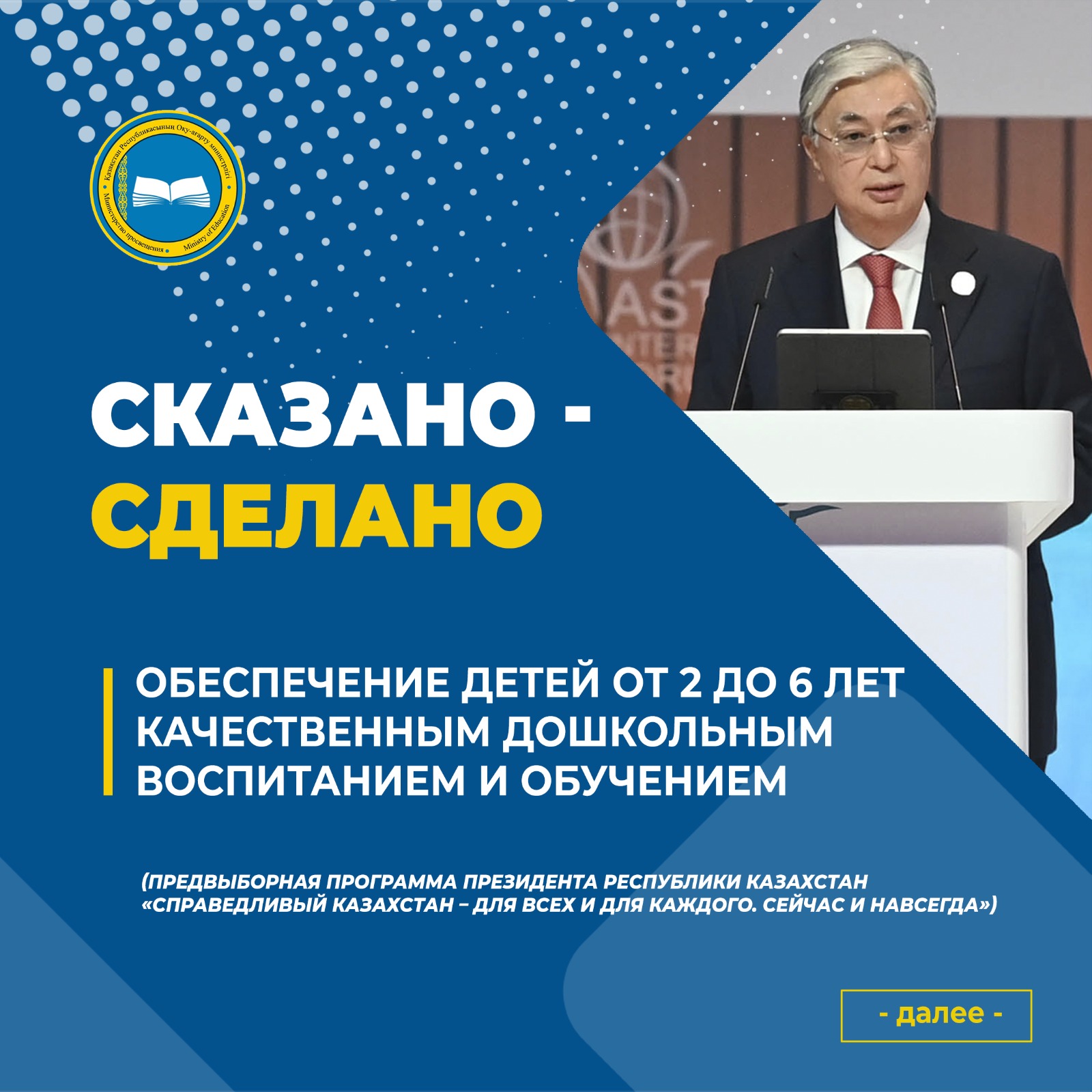 -принят пошаговый план по открытию дошкольных организации и вводу новых мест до 2025 года за счет размещения государственного образовательного заказа, ГЧП, а также открытие дошкольных организации на первых этажах жилых комплексов по принципу «шаговой доступности».