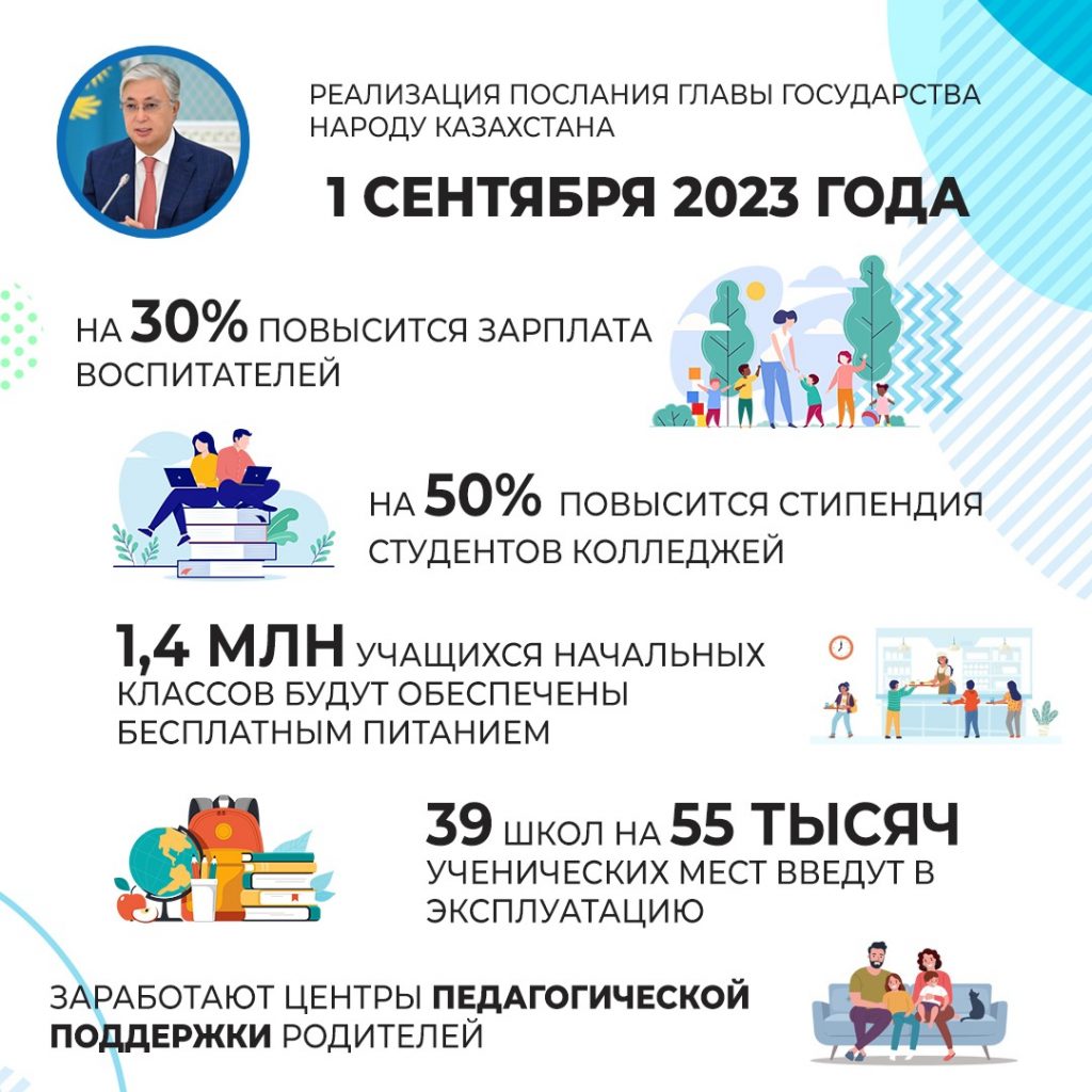 В рамках поручения Главы государства Министерством просвещения принимается ряд мер по повышению качества системы образования. Уже с этого месяца зарплата 97 тысяч воспитателей повысится на 30%, а стипендия студентов колледжей на 50%. Кроме того, более 1,4 млн учащихся 1-4 классов будут охвачены бесплатным питанием. 55 тысяч казахстанских детей начнут обучение в новых школах. Всего в 2023-2024 учебном году планируется запуск 154 новых школ на 132 тысячи ученических мест. В школах страны заработают центры педагогической поддержки родителей. Все эти меры направлены на повышение качества отечественного образования, обеспечение комфортных и безопасных условий для наших детей.