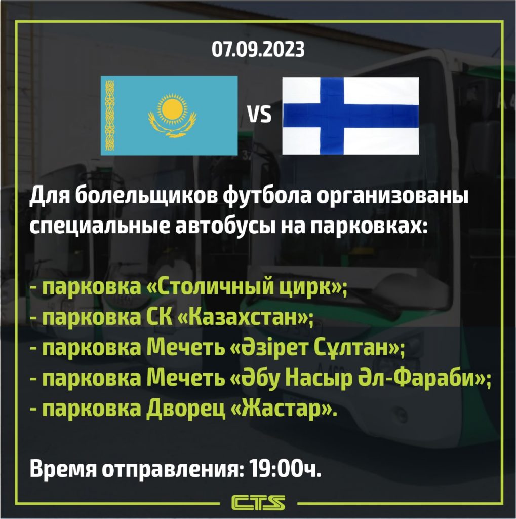 С целью минимизации заторов в районе стадиона «Астана Арена» на сегодняшний футбольный матч Казахстан – Финляндия с 5-ти перехватывающих парковок в 19:00 будут отправлены специальные шаттл-автобусы с обратным вывозом: