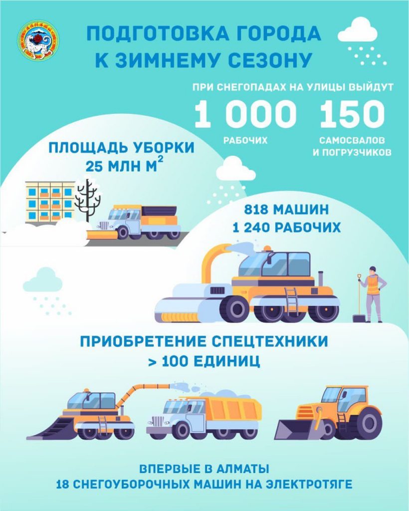 В зимний период к работам будет привлечено 818 ед. техники (из них «Алматы Тазалық» — 619 ед.) и 1240 дорожных рабочих («Алматы Тазалық» — 724 чел.). На случай обильных снегопадов со строительных организаций будет привлечено до 150 самосвалов и погрузчиков и до 1 тыс. рабочих.