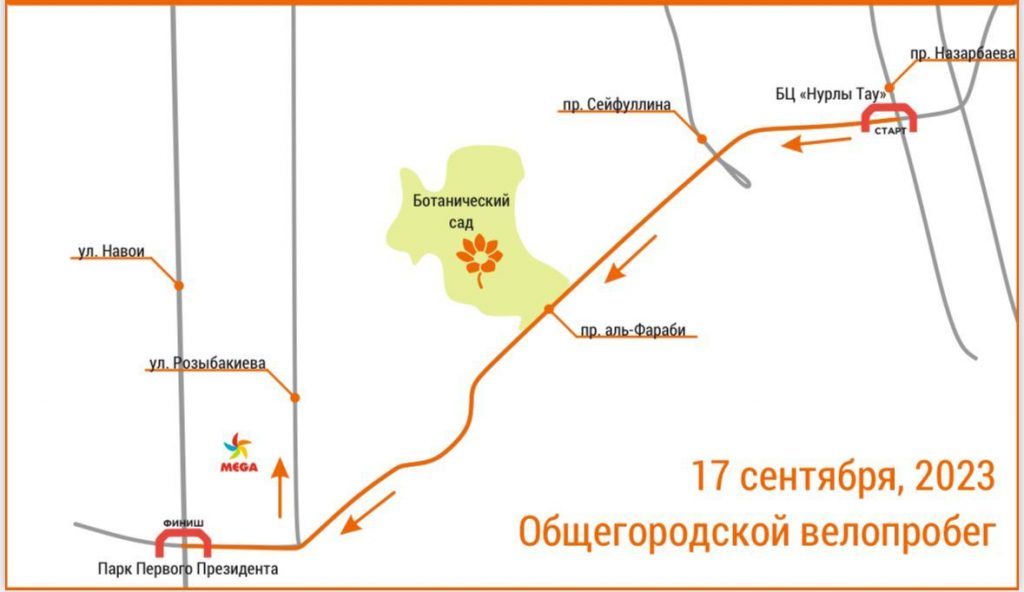 Согласно официальным уведомлениям от организаторов, движение будет перекрыто в западном направлении от полифункционального центра «Нурлы-тау» до кругового разворота по улице Мустафина. Затем участники велопробега продвинутся в восточном направлении от улицы Мустафина до проспекта Дулати.