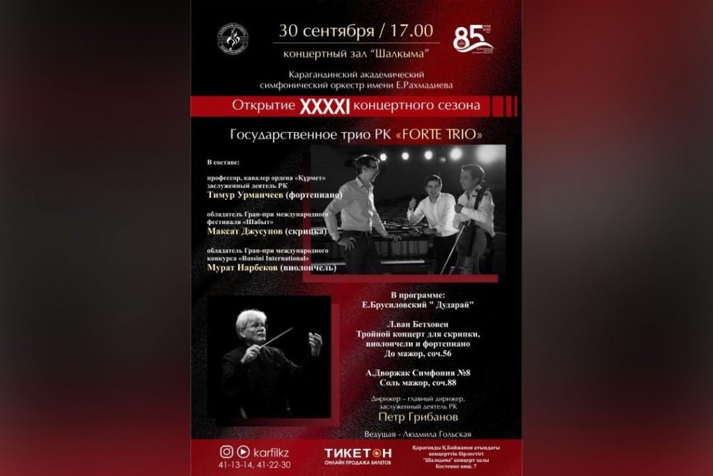 Открытие нового творческого сезона Карагандинского академического симфонического оркестра имени Еркегали Рахмадиева состоится 30 сентября в 17:00 в концертном зале «Шалкыма». Гости концерта будут Государственное трио Казахстана FORTE TRIO, в составе которого — профессор Тимур Урманчеев (фортепиано), Максат Джусупов (скрипка) и Мурат Нарбеков (виолончель). В программе концерта будут произведения Е. Брусиловского, Л. ван Бетховена и А. Дворжака. Дирижером выступит Петр Грибанов. Билеты можно приобрести в кассе концертного зала «Шалкыма» или на сайте ticketon.kz. Для получения дополнительной информации можно обратиться по телефонам 41-13-14 или 41-22-30. [Источник фото: Акимат Карагандинской области].