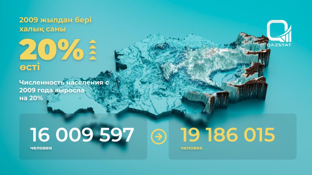 С прошлой переписи 2009 года население Казахстана выросло на 20%. Так, численность населения согласно итогам переписи по состоянию на 1 сентября 2021 года составила 19 186 015 человек.