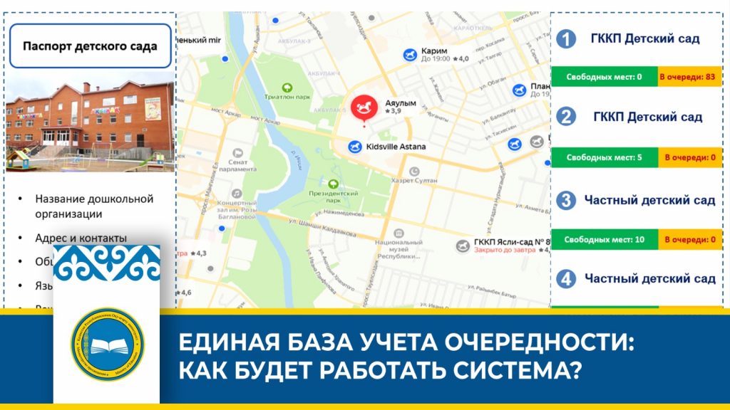 Получить информацию о садике и наличии свободных мест можно через Карту, которая будет доступна на портале электронного правительства в рамках Единой базы учета очередности. Родитель, ориентируясь по карте может выбрать детский сад рядом с местом проживания, ближе к работе или по другим личным предпочтениям.