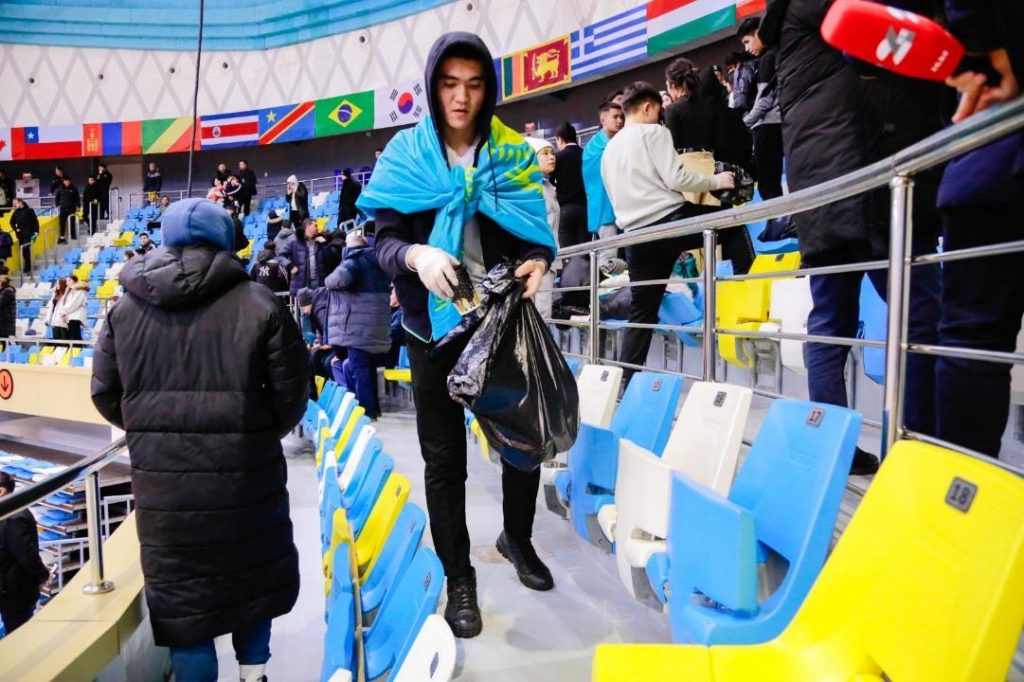 На фотографиях видно, как болельщики, волонтеры и все неравнодушные жители Астаны проходят по рядам и собирают бумажные и пластиковые стаканы, упаковки от еды и другой мусор после матча чемпионата мира по футзалу 2024 года против Нидерландов.