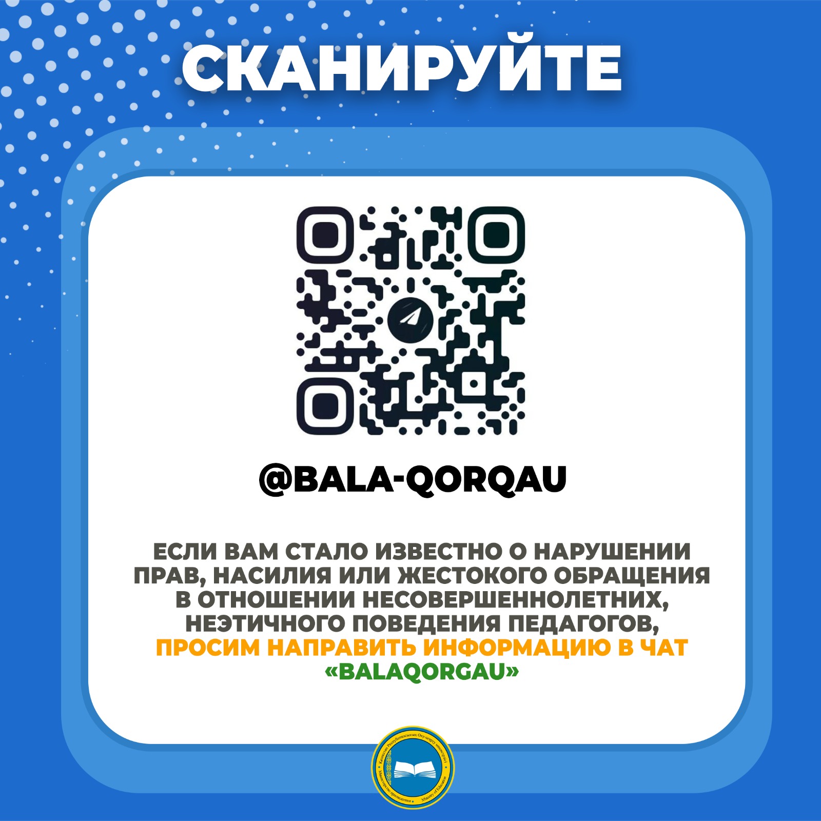 Работа в этом направлении будет продолжена. На сегодняшний день каждый может обратиться в чат «Bala Qorgau», QR-код которого размещен во всех организациях образования. Данный ресурс призван помочь школьникам и их родителям, которые столкнулись с трудностями в школе, дома и на улице.