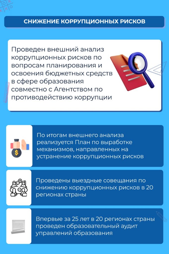 • Проведен внешний анализ коррупционных рисков по вопросам планирования и освоения бюджетных средств в сфере образования совместно с Агентством по противодействию коррупции