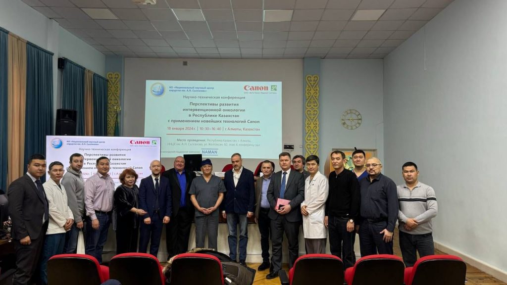 В гибридном формате велась трансляция из новой рентген-операционной, где инсталлирован и запущен первый в СНГ ангиографический комплекс Alphenix Hi-Def с уникальной технологией детектора сверх-высокого разрешения. На мастер-классе, организованном при поддержке компании RP Canon Medical Systems и их стратегического партнёра ТОО «Наман», присутствовали интервенционные хирурги из всех регионов Казахстана.