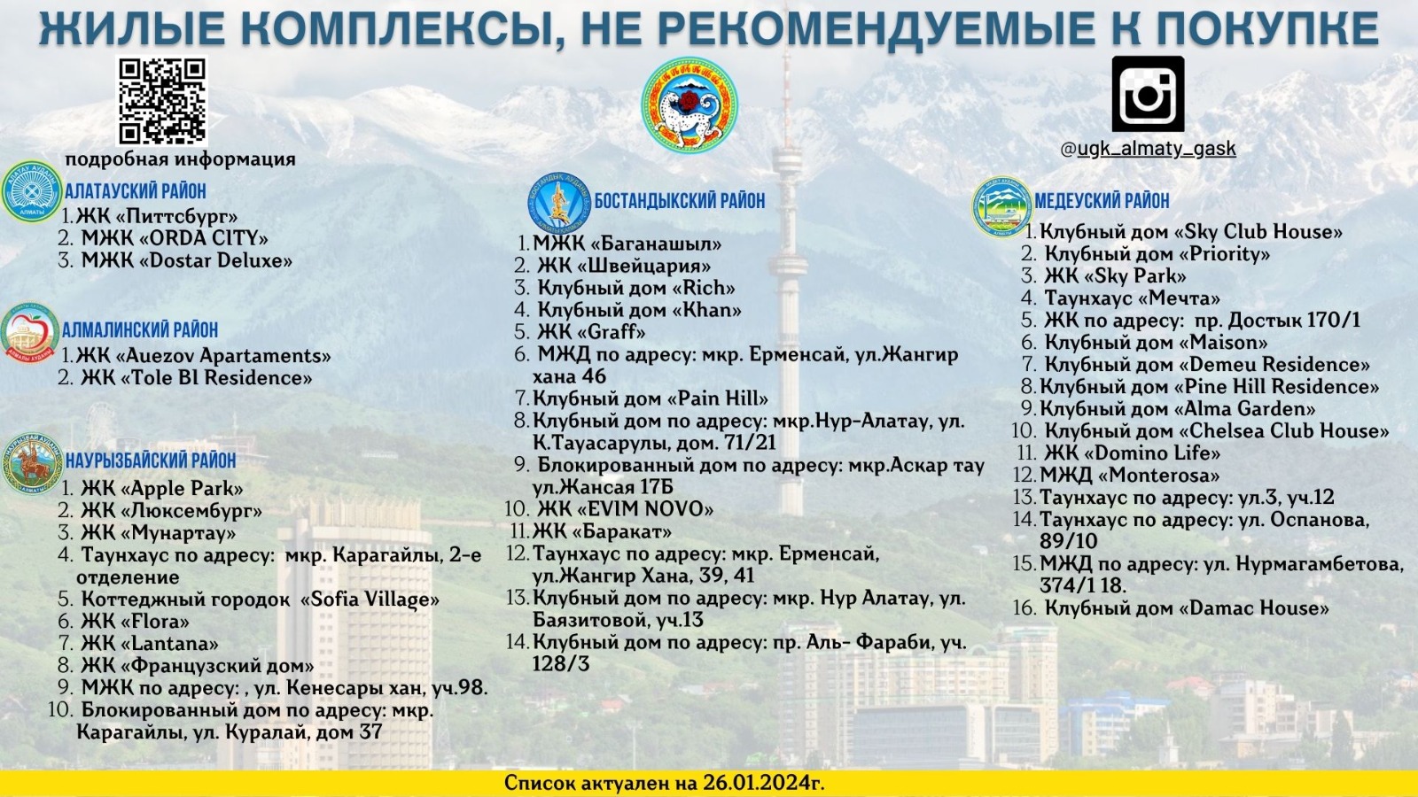 По актуальной информации на 26 января 2024 года список состоит из 45 жилых комплексов (ЖК), сообщает Управление градостроительного контроля Алматы.