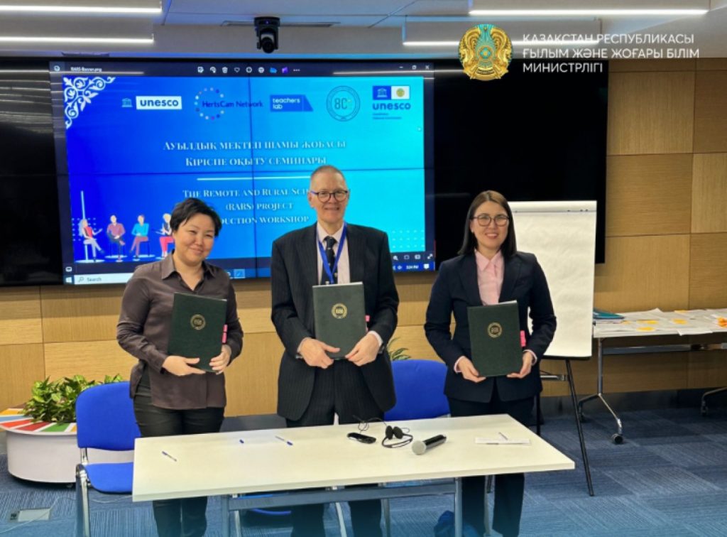 В ходе рабочего визита содиректора сети HertsCam Network, почётного ученого Великобритании Дэвида Фроста в Казахстан, был подписан трехсторонний меморандум о сотрудничестве между Казахским национальным женским педагогическим университетом, HertsCam Network и Teachers Lab, передает Optimism.kz. Церемония подписания состоялась в офисе UNESCO в Алматы.