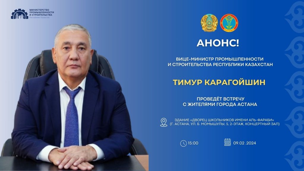 9 февраля в Астане вице-министр промышленности и строительства РК Тимур Карагойшин проведёт встречу с жителями города, передает Optimism.kz.
