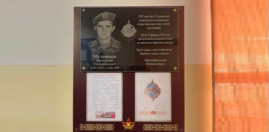 В Алматинской области открыли памятную доску воину-миротворцу из Казахстана Вячеславу Мезенцеву. Событие состоялось в здании средней школы № 6 в поселке Казцик, Илийского района, имени казахского актера кино и театра, Ануарбека Молдабекова. Участие в мероприятии приняли начальник отдела по делам обороны Илийского района подполковник Султан Гаппаров, генерал Махмут Телегусов и другие. На мемориальной доске выгравирована история Вячеслава Мезенцева, который погиб при исполнении воинского долга в 1995 году. Все участники церемонии почтили память героя минутой молчания.
