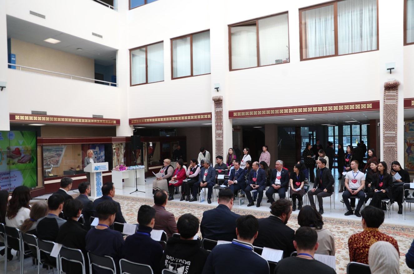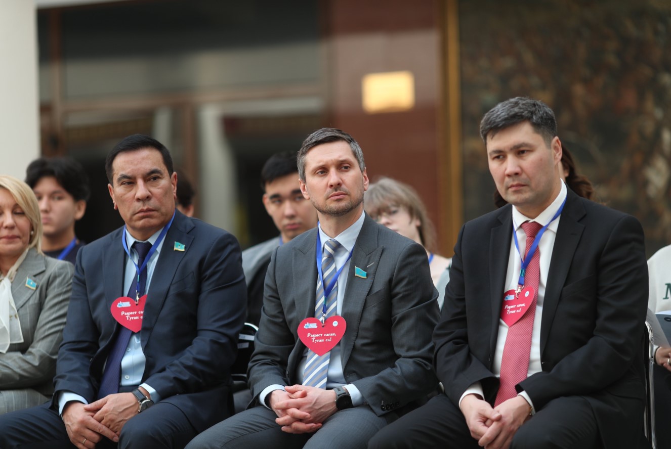 В атриуме «Күлтегін» прошел круглый стол, в котором участвовали депутаты Сената Парламента РК, ректор университета, руководство Республиканского центра по координации трансплантации и другие представители.