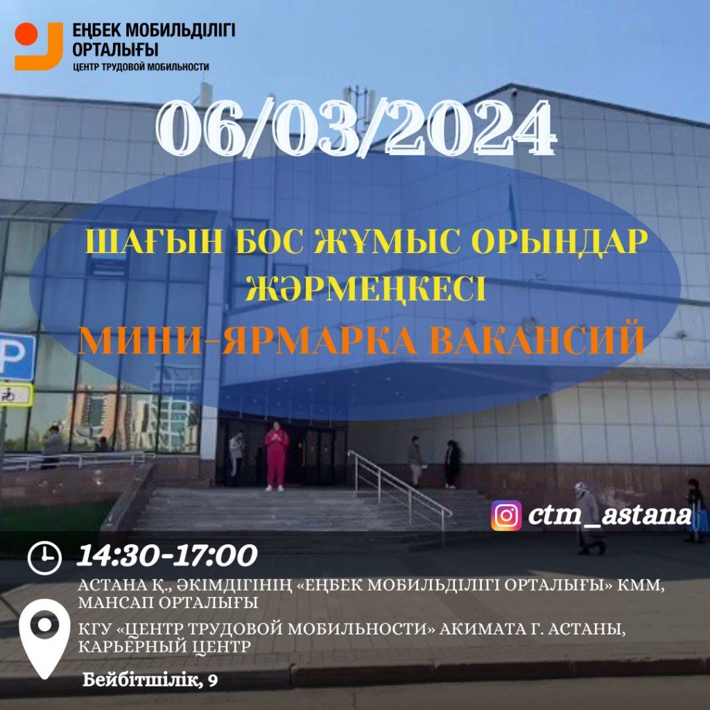 6 марта в 14:30 часов в КГУ «Центр трудовой мобильности» акимата г. Астаны состоится мини-ярмарка вакансий, сообщает официальный сайт городского акимата.