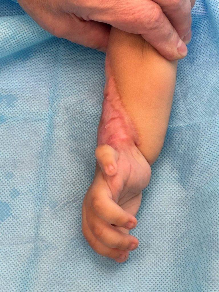 Ребенок получил термический ожог кисти 6 месяцев назад в возрасте до одного года. Сформировалась десмогенная контрактура (ограничение подвижности сустава) с вывихом 5 пальца руки. Была проведена сложнейшая операция, ювелирная работа по иссечению рубца и пересадки толстого расщепленного лоскута.