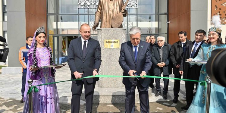 Президент Казахстана Касым-Жомарт Токаев и Президент Азербайджана Ильхам Алиев приняли участие в торжественной церемонии открытия Центра детского творчества имени казахского композитора Курмангазы.