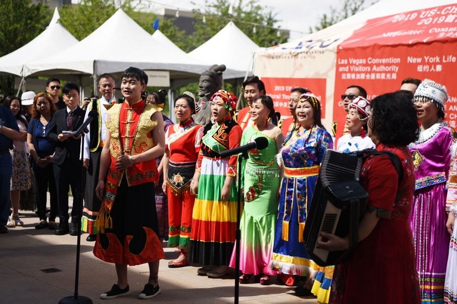 Китайские артисты из провинции Юньнань выступают на церемонии открытия Американо-китайского фестиваля культурного туризма в Лас-Вегасе, США, 10 мая 2019 года.